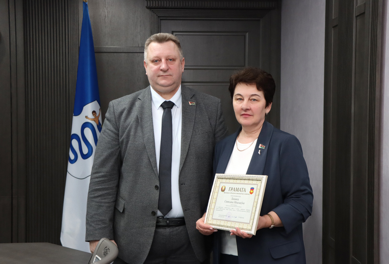 На фото: председатель райисполкома Михаил Гришкевич чествует Светлану Хоновец.