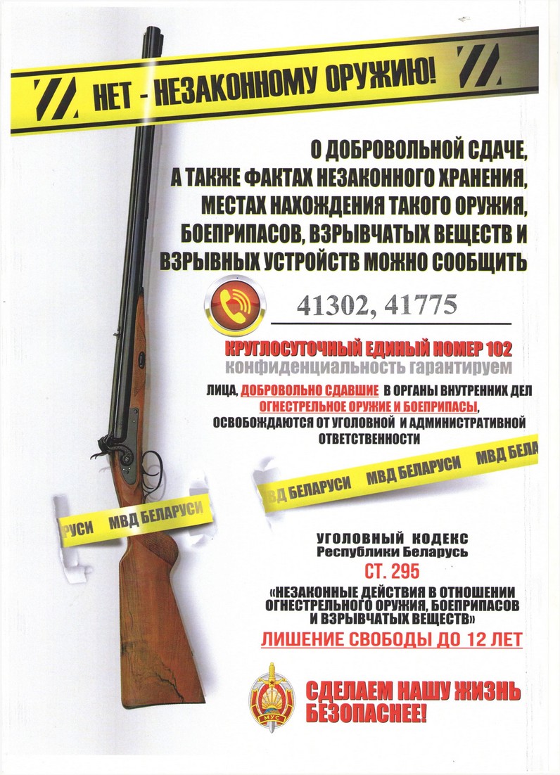 ОВД Пружанского райисполкома обращается к гражданам и предлагает проявить сознательность, оказать содействие милиции в своевременном выявлении и конфискации незаконно хранящегося оружия, боеприпасов, взрывчатых веществ, а также призывает добровольно сдать эти предметы. Тем самым обезопасить себя, своих родных и близких.